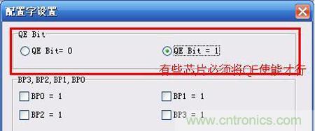 芯片中的配置參數(shù)需要手動修改,不能單純的加載文件后直接進行燒錄,如果不按照正確的規(guī)則設(shè)置參數(shù),必然會導致芯片無法正常運行。在SPI Flash的芯片燒錄時經(jīng)常遇到這類問題,類似于”QE”位必須使能,如下圖。