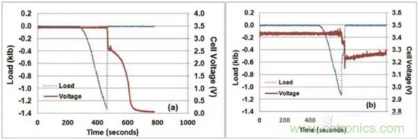 在對25Ah的NMC電池擠壓-扭轉(zhuǎn)測試中,發(fā)現(xiàn)50%SoC狀態(tài)下的電池都成功通過了測試,如圖a所示,60%SoC狀態(tài)下的電池有三只通過了測試,如圖b所示,另外的三只沒有通過測試,如圖c所示,可見60%SoC的電池通過測試和不通過測試的概率各為50%,而80%SoC的電池則都沒有通過測試,如圖d所示。由此可見,60%SoC是NMC電池安全性的一個分水嶺,低于這個數(shù)值時電池相對是安全的,高于這個數(shù)值,則電池在機(jī)械濫用的情況下的安全性將大大下降。