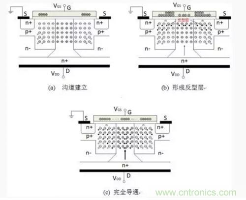 當MOS導(dǎo)通時,柵極和源極的電場將柵極下的P區(qū)反型,在柵極下面的P區(qū)產(chǎn)生N型導(dǎo)電溝道,同時,源極區(qū)的電子通過導(dǎo)電溝道進入垂直的N+區(qū),中和N+區(qū)的正電荷空穴,從而恢復(fù)被耗盡的N+型特性,因此導(dǎo)電溝道形成,垂直N+區(qū)摻雜濃度高,具有較低的電阻率,因此導(dǎo)通電阻低。