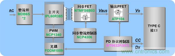 該設(shè)計(jì)主要采用安森美半導(dǎo)體的初級(jí)端高頻準(zhǔn)諧振反激式PWM控制器NCP1340、次級(jí)端同步整流控制器NCP4306、同步FET NTMFS6B03、開(kāi)關(guān)FET ATP104和偉詮的PD3.0協(xié)議控制器WT6632F/WT6615F。方案框圖如圖1所示。