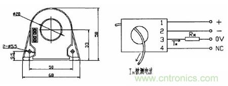 本系統(tǒng)選用的是宇森CBH100SF 型號的閉環(huán)霍爾電流傳感器。測量頻率是0-100KHz,額定電流100A,測量范圍:0-±150A,匝數(shù)比1:1000,精度0.2%-1%,相應時間:《lus。結(jié)構(gòu)如圖3-3 所示: