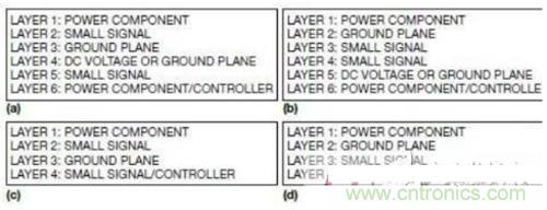 圖1a和1c分別是六層和四層開關電源PCB的不良層結構。這些結構將小信號層夾在大電流功率層和地層之間,因此增加了大電流/電壓功率層與模擬小信號層之間耦合的電容噪聲。