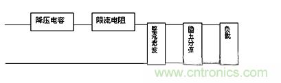 D1作半波整流用,C2、C3為濾波電容,交流電源U上半周時(shí),經(jīng)C1、R1降壓,由D1整流后給電容C2平滑濾波輸出