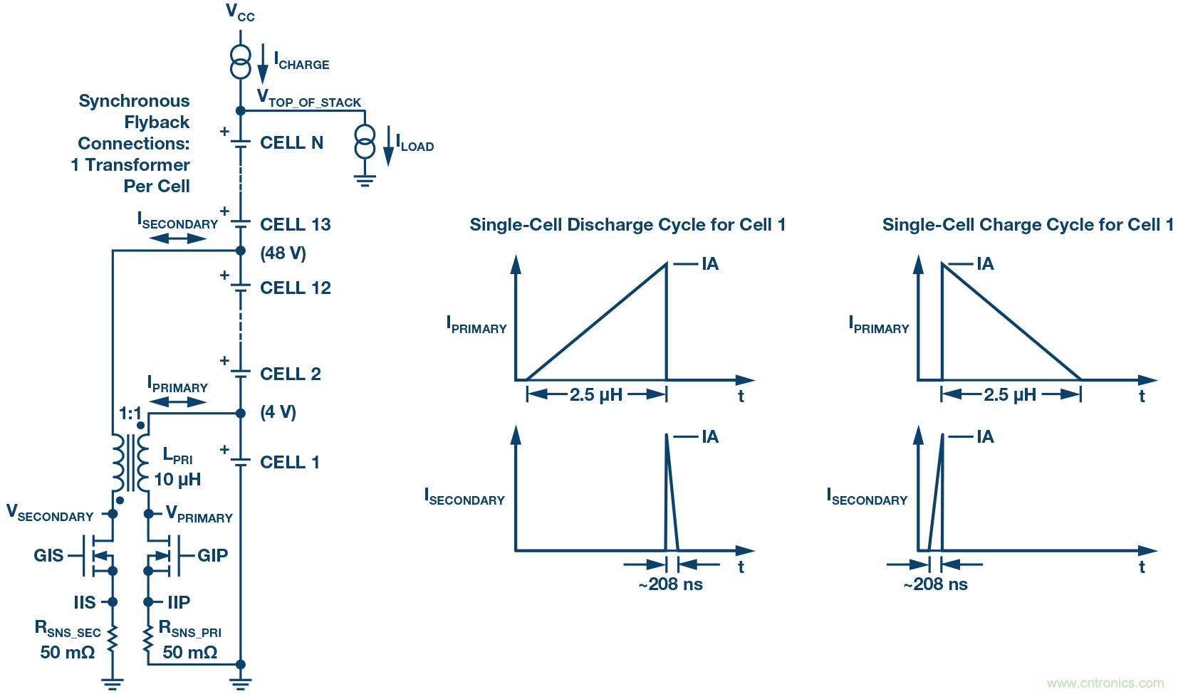 LTC3300-2中的每個均衡器都使用非隔離邊界模式同步反激式功率級,以實現(xiàn)每個電池單元的高效充電和放電。6個均衡器各自都需要自己的