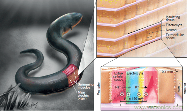 電鰻的所有放電體可以同時翻轉(zhuǎn),它們的微小電壓加起來就能產(chǎn)生強大的電能。