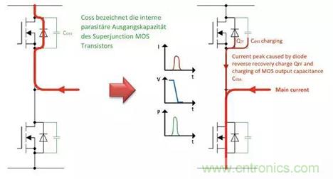除了電阻損耗以外,開關(guān)損耗由兩種損耗機(jī)制決定:首先是存儲(chǔ)在續(xù)流二極管中的反向恢復(fù)電荷(Qrr),它導(dǎo)致激活的低邊開關(guān)晶體管導(dǎo)通出現(xiàn)電流峰值;其次是對(duì)阻塞高邊開關(guān)晶體管的輸出電容(COSS)進(jìn)行再充電時(shí)所流動(dòng)的充電電流峰值。