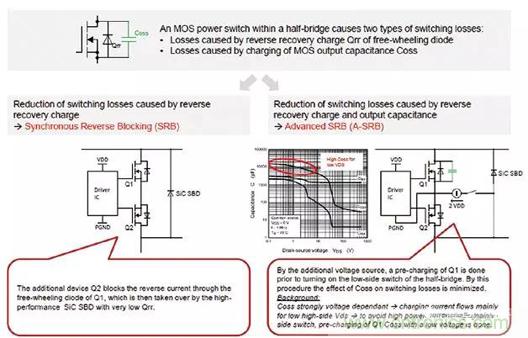 同步反向阻斷(SRB)串聯(lián)第二開關(guān)晶體管Q2以阻斷開關(guān)晶體管Q1的續(xù)流二極管中的反向電流。Q2的激活與Q1同步。反向電流通過(guò)并聯(lián)的碳化硅(SiC)肖特基二極管,該二極管具有高擊穿電壓和極低的反向恢復(fù)電荷,這大大降低了Qrr對(duì)開關(guān)損耗的影響。Q2的續(xù)流二極管的極性確保晶體管不能產(chǎn)生高電壓,因此,低介電強(qiáng)度(60 V)的型款就足夠了。