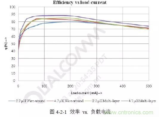 但是,疊層電感的SATI也較小,因此其在重載時會有較大的紋波電流,導(dǎo)致輸出的紋波電壓也相應(yīng)增大。圖4-2-1所示是Taiyo Yuden的兩種繞線電感與三星的兩種疊層電感負(fù)載電流和效率的關(guān)系曲線。