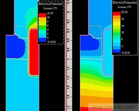 圖4:完全導(dǎo)通(左)和線性區(qū)的電勢(shì)分布圖