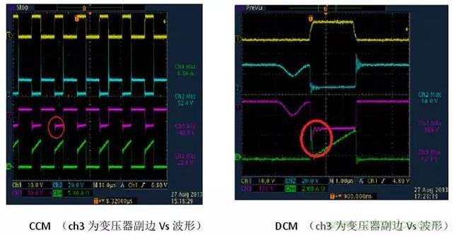 1)變壓器初級電流,CCM模式是梯形波,而DCM模式是三角波。