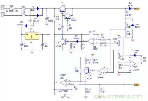本電路設(shè)有反極性保護(hù)電路,由D4,U,U1D,T1及外圍元件構(gòu)成,當(dāng)電池反接時(shí),充電器限制輸出電流不致發(fā)生事故。充電指示由U,D7及外圍元件構(gòu)成,充電時(shí),D7點(diǎn)亮,充電器進(jìn)入浮充狀態(tài)后,D7熄滅,表示充電結(jié)束。