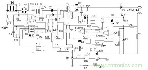 LM358(雙運(yùn)算放大器,1腳為電源地,8腳為電源正)及其外圍電路提供12V工作電源D9為L(zhǎng)M358提供基準(zhǔn)電壓,經(jīng)R26,R4分壓達(dá)到LM358的第二腳和第5腳正常充電時(shí),R27上端有0.15-0.18V左右電壓,此電壓經(jīng)R17加到LM358第三腳,從1腳送出高電壓當(dāng)電池電壓上升到44.2V左右時(shí),充電器進(jìn)入恒壓充電階段,輸出電壓維持在44.2V左右,充電器進(jìn)入恒壓充電階段,電流逐漸減小當(dāng)充電電流減小到200mA-300mA時(shí),R27上端的電壓下降,LM358的3腳電壓低于2腳,1腳輸出低電壓,Q2關(guān)斷,D6熄滅同時(shí)7腳輸出高電壓,此電壓一路使Q3導(dǎo)通,D10點(diǎn)亮另一路經(jīng)D8,W1到達(dá)反饋電路,使電壓降低充電器進(jìn)入涓流充電階段1-2小時(shí)后充電結(jié)束。