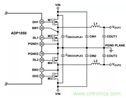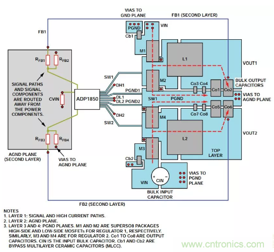 作為例子的開關(guān)調(diào)節(jié)器布局采用雙通道同步開關(guān)控制器 ADP1850,第一步是確定調(diào)節(jié)器的電流路徑。然后,進行物理規(guī)劃和電源器件的考慮。此外,我們需要了解一點:電流路徑?jīng)Q定了器件在該低噪聲布局布線設(shè)計中的位置。