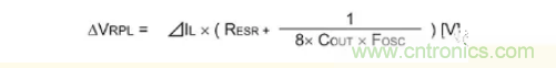 輸出紋波電壓是通過上圖的電感電流IL紋波ΔIL和輸出電容器的容值、ESR、ESL所產(chǎn)生的電壓合成波形,用下面公式表示。