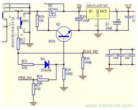 圖中電池的正電通過開關(guān)S1接到場效應(yīng)管Q1的2腳源極,由于Q1是一個P溝道管,它的1腳柵極通過R20電阻提供一個正電位電壓,所以不能通電,電壓不能繼續(xù)通過,3v穩(wěn)壓IC輸入腳得不到電壓所以就不能工作不開機!這時,如果我們按下SW1開機按鍵時,正電通過按鍵、R11、R23、D4加到三極管Q2的基極,三極管Q2的基極得到一個正電位,三極管導(dǎo)通(前面講到三極管的時候已經(jīng)講過),由于三極管的發(fā)射極直接接地,三極管Q2導(dǎo)通就相當(dāng)于Q1的柵極直接接地,加在它上面的通過R20電阻的電壓就直接入了地,Q1的柵極就從高電位變?yōu)榈碗娢唬琎1導(dǎo)通電就從Q1同過加到3v穩(wěn)壓IC的輸入腳,3v穩(wěn)壓IC就是那個U1輸出3v的工作電壓vcc供給主控,主控通過復(fù)位清0,讀取固件程序檢測等一系列動作,輸處一個控制電壓到PWR_ON再通過R24、R13分壓送到Q2的基極,保持Q2一直處于導(dǎo)通狀態(tài),即使你松開開機鍵斷開Q1的基極電壓,這時候有主控送來的控制電壓保持著,Q2也就一直能夠處于導(dǎo)通狀態(tài),Q1就能源源不斷的給3v穩(wěn)壓IC提供工作電壓!SW1還同時通過R11、R30兩個電阻的分壓,給主控PLAY ON腳送去時間長短、次數(shù)不同的控制信號,主控通過固件鑒別是播放、暫停、開機、關(guān)機而輸出不同的結(jié)果給相應(yīng)的控制點,以達到不同的工作狀態(tài)!