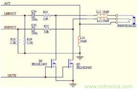 上圖是一個有主控控制耳機有沒有聲音輸出的電路圖,聲音的左右聲道分別通過隔直流電容C13、C14和電阻R51、R52送到耳機孔,但是在電阻R51、R52和耳機孔之間卻接入了一個N溝道的mos場效應(yīng)管,這個場效應(yīng)管的柵極連接在一起受著MUTE的控制,當(dāng)MUTE的地方處于高電位時候,Q4、Q5導(dǎo)通,就會把聲音通過Q4、Q5入地,耳機里就不會有聲音了,當(dāng)MUTE的地方處于低電位時候,Q4、Q5關(guān)斷,聲音就只有通過耳機而發(fā)出聲音了!