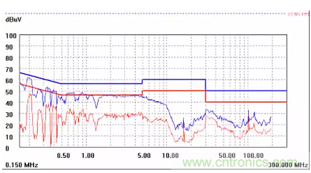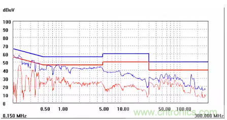 圖一a可以看出,改變PCB布局后130M-200M已經(jīng)完全被衰減,但是30-130M沒(méi)有圖一效果好,可能變壓器出線無(wú)交叉好一些。仔細(xì)觀察,此IC具有抖頻功能,傳導(dǎo)部分頻段削掉了一些尖峰;