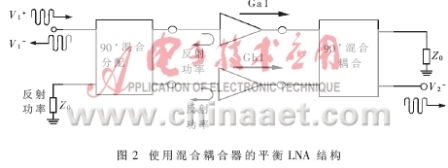 通常,在LNA的設(shè)計中主要考慮低噪聲系數(shù)(NF)。足夠的增益(G)和絕對的穩(wěn)定性?對于本文TMA放大器中LNA設(shè)計的實際技術(shù)規(guī)范要求如表1所示。同時要求所使用的LNA結(jié)構(gòu)滿足良好的輸入輸出匹配,保證LNA的穩(wěn)定性,兼顧到功分/合路網(wǎng)絡(luò)的低損耗、幾何尺寸小,工作帶寬內(nèi)良好的相位和幅度匹配,足夠的工作帶寬(涵蓋在1.95GHz左右),符合CDMA標準上行頻率?據(jù)此選擇了以平衡結(jié)構(gòu)為特征的LNA結(jié)構(gòu)(如圖2)。這種平衡結(jié)構(gòu)的重要特性是:它較單階放大器的截點高出一倍,并以標準50Ω實現(xiàn)輸入輸出匹配,在某一路硬件失效時電路的冗余設(shè)計可保證系統(tǒng)的正常運行。但通常增益減少6dB。