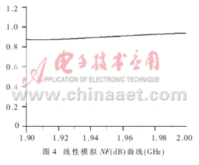 為使圖2中的LNA模塊噪聲系數(shù)。截點和增益達到表1中的各項指標,設(shè)計漏極電流Id=60mA?同時,要求單個放大元件在此偏置點的工作性能達到優(yōu)于表1的規(guī)范值。由于E-pHEMT元件ATF-54143在電流Id=60mA下,具有最佳的截點(IP3)和最小噪聲系數(shù)Fmin;漏源極電壓Vds為3V時,具有稍高的增益;偏置是+5V穩(wěn)定電壓,所需單極性+3V電壓更具有優(yōu)勢,因此選擇其作為放大元件。