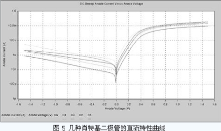 圖4 所示是在UMC 0.18um CMOS 工藝下設(shè)計(jì)的幾種肖特基二極管的版圖。它們的直流特性測(cè)試曲線如圖5 所示。從直流特性的測(cè)試結(jié)果