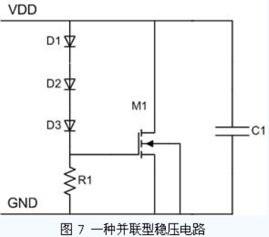 在RFID 標(biāo)簽芯片中,需要有一個(gè)較大電容值的儲(chǔ)能電容存儲(chǔ)足夠的電荷以供標(biāo)簽在接收調(diào)制信號(hào)時(shí),仍可在輸入能量較小的時(shí)刻(例如OOK調(diào)制中無(wú)載波發(fā)出的時(shí)刻),維持芯片的電源電壓。如果輸入能量過(guò)高,電源電壓升高到一定程度,穩(wěn)壓電路中電壓感應(yīng)器將控制泄流源將儲(chǔ)能電容上的多余電荷釋放掉,以此達(dá)到穩(wěn)壓的目的。圖7 是其中一種并聯(lián)型穩(wěn)壓電路。三個(gè)串聯(lián)的二極管D1、D2、D3 與電阻R1 組成電壓感應(yīng)器,控制泄流管M1 的柵極電壓。當(dāng)電源電壓超過(guò)三個(gè)二極管開(kāi)啟電壓之和后,M1 柵極電壓升高,M1 導(dǎo)通,開(kāi)始對(duì)儲(chǔ)能電容C1 放電。