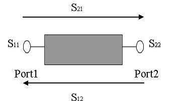 二端口網(wǎng)絡(luò)有四個(gè)S參數(shù),Sij代表的意思是能量從j口注入,在i口測(cè)得的能量,如S11定義為從Port1口反射的能量與輸入能量比值的平方根,也經(jīng)常被簡(jiǎn)化為等效反射電壓和等效入射電壓的比值,各參數(shù)的物理含義和特殊網(wǎng)絡(luò)的特性如下: