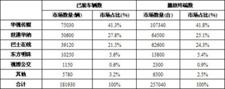 2008年,中國(guó)車(chē)載公交視聽(tīng)系統(tǒng)市場(chǎng)品牌競(jìng)爭(zhēng)格局中,華視傳媒憑借其強(qiáng)大的采用數(shù)字移動(dòng)電視技術(shù)的聯(lián)播網(wǎng)以及其靈活獨(dú)特的合作模式,成為中國(guó)車(chē)載公交視聽(tīng)系統(tǒng)市場(chǎng)已裝車(chē)輛和播放終端兩大指標(biāo)的市場(chǎng)第一,緊隨其后的是世通華納和巴士在線,東方明珠由于主要局限于上海市場(chǎng),市場(chǎng)排名為第四。作為地方的車(chē)載視聽(tīng)系統(tǒng)運(yùn)營(yíng)商視博公交,則完全局限于杭州本土市場(chǎng)發(fā)展。DMG集團(tuán)公司,由于更加集中于地鐵視頻廣告的運(yùn)營(yíng)和推廣,在全國(guó)的整體實(shí)力上,還不足以顛覆目前的格局。