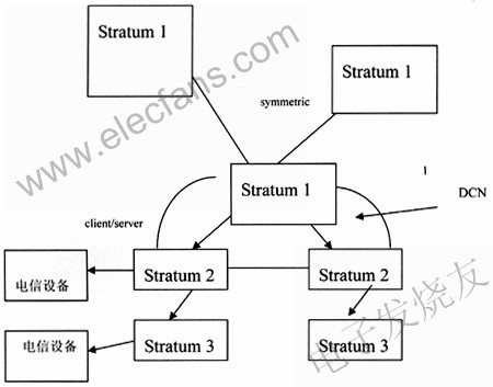 本地網(wǎng)級的Stratum1時間服務(wù)器之間互相聯(lián)網(wǎng),以symmetric方式互相校時,避免GPS時間源出故障造成中斷,還可以達(dá)到更高精度。Stratum1時間服務(wù)器對下級采用client/server方式。Stratum1時間服務(wù)器取得GPS時間信號和其他授時方式時間信號,比如其他導(dǎo)航衛(wèi)星,短波,長波方式,互為備用。上下級Stratum采用DCN相連或?qū)>€相連,保持穩(wěn)定相連。各級時間服務(wù)器把時間信號發(fā)到各個通信設(shè)備,如圖3所示。