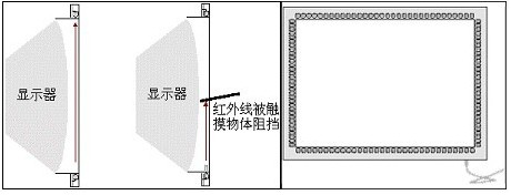 紅外觸摸屏是在緊貼屏幕前密布X、Y方向上的紅外線矩陣,通過不停的掃描是否有紅外線被物體阻擋檢測并定位用戶的觸摸。如下圖所示,這種觸摸屏是在顯示器的前面安裝一個外框,外框里設計有電路板,從而在屏幕四邊排布紅外發(fā)射管和紅外接收管,一一對應形成橫豎交叉的紅外線矩陣。每掃描完一圈,如果所有的紅外對管通達,綠燈亮,表示一切正常。