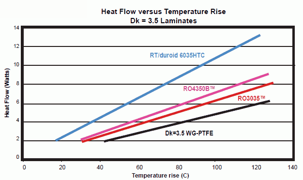 由于很多系統(tǒng)(包括商業(yè)通信和戰(zhàn)術(shù)軍事系統(tǒng))都需要具有高可靠性和穩(wěn)定的電氣性能,電路板材料供應(yīng)商近年來非常關(guān)注熱管理問題,開發(fā)出的材料不僅能夠處理類似功率放大器等電路中的較高功率級,而且在高溫下不會發(fā)生電氣性能改變。例如,Rogers Corporation公司最近發(fā)布的RT/duroid 6035HTC電路材料就是一種陶瓷填充PTFE復(fù)合材料,其導(dǎo)熱率高達(dá)1.44 W/m/K,是標(biāo)準(zhǔn)FR-4型電路板材料的好幾倍(見圖1)。這種材料整合了穩(wěn)定的機(jī)械與電氣性能以及導(dǎo)熱性能,因此可作為高頻功率放大器的理想材料。