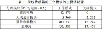 無線傳感器的三個主要消耗電能的模塊是:感應(yīng)模塊、無線通信模塊和微控制器模塊,如表1所示。這三個模塊主要有兩個操作模式:關(guān)機模式和工作模式。在這兩種模式下分析了每種模塊的功耗,以及總的消耗量。