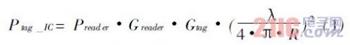 無源射頻標(biāo)簽依靠讀寫器發(fā)射出的電磁波獲取能量。標(biāo)簽芯片獲得的能量與很多因素都有關(guān)系,例如空間環(huán)境的反射,傳播媒介的吸收系數(shù),溫度等。在理想自由空間,連續(xù)載波的情況下,有下面的近似公式: