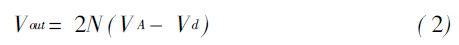 RFin正半周期時,節(jié)點(diǎn)1的最大電壓為VA+(VA-Vd)。該電壓使得M1導(dǎo)通,C2充電,直到C2兩端達(dá)到最大電壓,即節(jié)點(diǎn)2的最大電壓,為VA+(VA- Vd)-Vd=2(VA-Vd)。依次類推,C3兩端能夠獲得的最大電壓為3(VA-Vd),節(jié)點(diǎn)4的最大電壓為4(VA-Vd)。節(jié)點(diǎn)2N的最大電壓為 2N(VA-Vd)。于是,對于2N級電路,輸出直流電壓為: