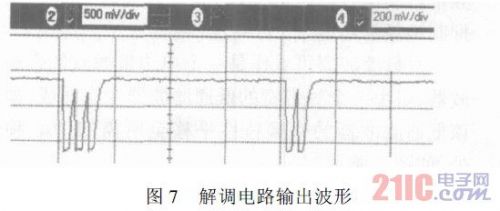讀寫器發(fā)送1s脈寬的OOK調(diào)制信號。解調(diào)電路輸出波形如圖7所示。下脈沖上升時間較長是由于示波器探頭引入的16pF電容所致。