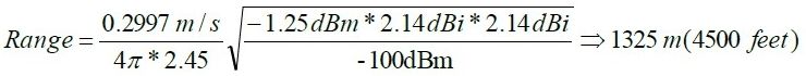 例如,如果使用弗里斯方程式計(jì)算一個2.45GHz 無線鏈路的最大通信距離,其發(fā)射功率為-1.25dBm,接收靈敏度為-100dBm 以及兩個天線增的益都是2.14dBi。需要注意的是,2.14dBi 是偶極天線的理論增益,而考慮損耗時(shí)一般達(dá)不到這一值。