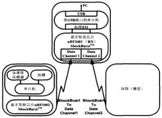 鼠標(biāo)具體的工作原理為:鼠標(biāo)內(nèi)的單片機(jī)實時監(jiān)測加速度傳感器的移動和按鍵狀態(tài),當(dāng)鼠標(biāo)器的狀態(tài)發(fā)生變化時,單片機(jī)讀出按鍵狀態(tài)并及時得到當(dāng)前X/Y坐標(biāo)移動的位置;接著單片機(jī)就將變化的數(shù)據(jù)按照約定的通信協(xié)議將數(shù)據(jù)打包通過無線收發(fā)技術(shù)發(fā)送到接收端,接收端通過單片機(jī)解碼把符合鼠標(biāo)USB協(xié)議的數(shù)據(jù)包送至PC主機(jī)的USB端口;PC中的鼠標(biāo)驅(qū)動程序接收到端口的數(shù)據(jù)包后將其解碼再傳送給相應(yīng)的應(yīng)用軟件,從而完成鼠標(biāo)器的檢測和控制過程。