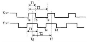 為了實現(xiàn)高精度測量,考慮到T2易受溫度漂移的影響,必須周期性地更新T2的平均值。一種新的改進(jìn)型脈寬調(diào)制(PWM)解碼方法是通過占空比調(diào)制在X軸和Y軸使用相同的三角形參考波 ,使得每個周期中 T1的中點達(dá)到同步 ,這種方法能加快數(shù)據(jù)傳輸時間,也稱之為高速解碼,X軸和Y軸的占空比輸出如圖2所示。
