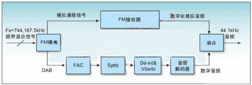 除了去隔行處理和誤碼校正,數(shù)字碼流還必須采用iBiquity公司的HD編解碼器(HDC)。同時,如前所述還須并行處理模擬信號。最后,數(shù)字化的模擬音頻和數(shù)字音頻(來自HDC)混合在一起產(chǎn)生期望的HD無線音頻(見圖2)。