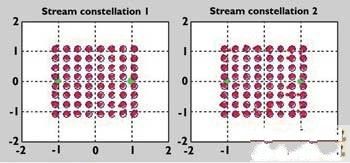 圖2 Tx1和Tx2的64 QAM數(shù)據(jù)流信號的群視圖,這是一種理想情況,其中調(diào)制信號是沒有失真的