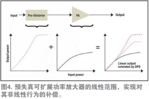 自適應(yīng)DPD可以擴(kuò)展寬頻帶射頻(RF)PA的直線性能(straight-line performance),而且遠(yuǎn)遠(yuǎn)超過(guò)正常擴(kuò)展范圍。如前所述,當(dāng)輸出功率增加時(shí),輸出功率與理想線性性能曲線發(fā)生偏離。這正是PA放大輸出信號(hào)出現(xiàn)失真的地方,從而導(dǎo)致信號(hào)質(zhì)量下降及干擾。DPD可將PA失真輸出信號(hào)與非失真輸入信號(hào)進(jìn)行比較。然后,將輸出信號(hào)中一個(gè)與失真正好對(duì)立的信號(hào)添加至輸入,從而有效消除失真。由于DPD可擴(kuò)展PA的線性范圍,因此將其稱為線性化技術(shù)(如圖4)。