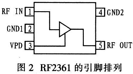 圖2為RF2361的引腳排列,其中:RF IN為低噪聲功率放大器輸入,需通過一阻抗匹配網(wǎng)絡(luò)達(dá)到50Ω阻抗匹配:RF0UT為低噪聲功率放大器輸出,也需通過一阻抗匹配網(wǎng)絡(luò)達(dá)到50Ω阻抗匹配;同時(shí)電源VCC給整個(gè)電路提供工作電壓。VPD用于控制偏置電流,與偏置電阻R1共同確定偏置電流。GND1、GND2為接地。