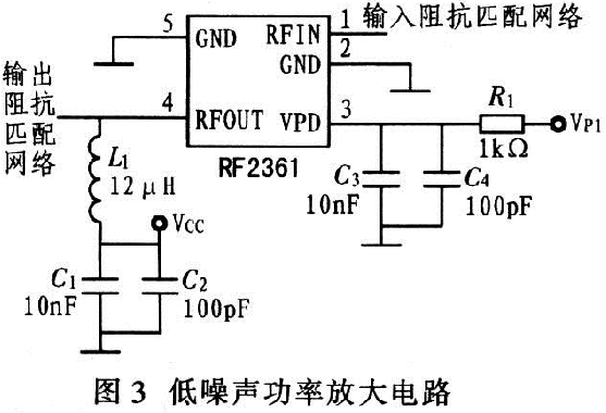 以低噪聲功率放大器RF2361為核心設(shè)計(jì)的低噪聲功率放大電路,如圖3所示,其VPD引腳上的并聯(lián)電容器實(shí)現(xiàn)電源VPD的濾波,RFOUT引腳上的電感電容串并聯(lián)網(wǎng)絡(luò)可對(duì)電源VCC濾波?! ?/p>