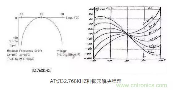 AT切晶體頻率溫度曲線為三次曲線,呈躺著的"S"型曲線,隨著溫度的變化,溫漂呈"S"型軌跡變化,大致在-10℃和+60℃時(shí),有兩個(gè)"拐點(diǎn)",即溫漂又會(huì)反方向拐回來(lái)。因此,只要控制好晶片的切角在一定的公差范圍內(nèi),那么保證兩個(gè)拐點(diǎn)溫漂在-40℃~85℃時(shí)不超過(guò)±30ppm并不是一件難事。然而,AT切晶體只針對(duì)MHZ頻率的晶體,如何轉(zhuǎn)換成32.768KHZ頻率?鐘振32.768KHZ通過(guò)分頻方式,便可以實(shí)現(xiàn)。如采用AT切16.777216MHZ晶體,通過(guò)512分頻,那么就可以得到想要的32.768KHZ頻率。鐘振實(shí)現(xiàn)對(duì)頻率的分頻并不困難,都集成在振蕩IC內(nèi)部。因此,使用AT切MHZ 分頻實(shí)現(xiàn)的32.768KHZ鐘振,在頻率溫度特性上,有很大的改良,在沒(méi)有進(jìn)行溫度補(bǔ)償?shù)臅r(shí)候,-40℃~85℃條件下,溫度頻差保持在±30ppm甚至±20ppm都是可以實(shí)現(xiàn)的。