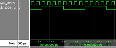 根據(jù)所需的時鐘頻率為1024kHz的時鐘,而晶振時鐘的頻率為8192kHz,晶振時鐘與所需的時鐘頻率恰巧是8倍的整數(shù)倍關(guān)系,因此需要對8192kHz的晶振時鐘進行8分頻來獲得所需要的時鐘。根據(jù)整數(shù)倍分頻器的設(shè)計方法原理,通過ISE9.1邏輯設(shè)計工具,利用VHDL硬件描述語言來進行8分頻的分頻器設(shè)計。然而8又是偶數(shù),所以需要設(shè)計的是偶數(shù)分頻器。對設(shè)計的內(nèi)容通過Modelsim6.5仿真軟件進行仿真驗證,結(jié)果如圖3-1所示。