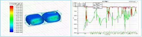 通過以上電場(chǎng)分布圖可以觀察到,單腔雙模,單腔三??梢宰杂蛇x擇。在高次模出現(xiàn)的頻率點(diǎn)上,通過選擇介電常數(shù),與控制諧振腔尺寸,對(duì)高次模進(jìn)行優(yōu)化。盡量拉遠(yuǎn)高次模出現(xiàn)的頻率,減小對(duì)通帶的影響。