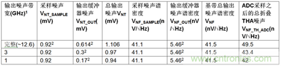 在采樣過程中,下游ADC將輸入帶寬(表1和表2中所示的濾波和ADC輸入帶寬的組合)上的所有THA噪聲外差到一個ADC奈奎斯特區(qū)間。因此,總折疊噪聲是ADC噪聲帶寬上的總THA輸出放大器時域噪聲的一部分。