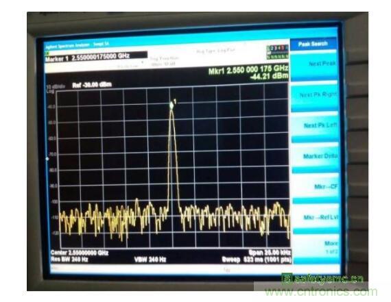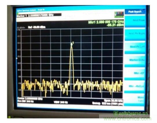 開關(guān)是正常工作的,由于天線開關(guān)本身是非線性器件,因此首先確認(rèn)天線開關(guān)的影響。將天線開關(guān)旁路(天線仍然正常)如圖5所示,發(fā)現(xiàn)此時2.55GHz的雜訊可以降低到-55.7dBm左右,因此可以確定天線區(qū)域的雜訊就是調(diào)諧開關(guān)造成的。