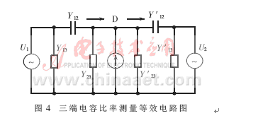如果將兩個三端電容串接起來,分別用兩個信號源供電,就形成了如圖4所示的等效電路,其中,Y12=jωC12,Y′12=jωC′12。在公共點(diǎn)D與接地端之間連接一個檢流計(jì),調(diào)節(jié)兩個外加電壓的幅值和相位,使通過兩個直接電容流向D點(diǎn)的電流大小相等、方向相反,直道檢流計(jì)指零,便可得到下面的關(guān)系式: