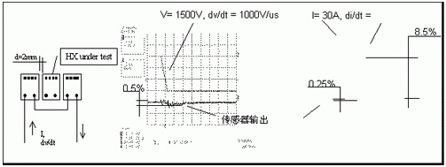 開關設備每次開關時產生的高dv/dt值將在主電纜和傳感器的電子電路之間產生電容電流。大多數模擬線性放大器對這種寄生電流很靈敏。因此,dv/dt噪聲將被疊加在輸出信號上。根據變動電壓的幅度和斜坡,初始尖峰和后來的振蕩有時會非常高,以致它們會激活傳感器的電流保護電路,進而使逆電器暫停運轉。LEM的經驗在HX系列設計階段幫助保證了對關鍵噪聲的完美免疫力,而又不會損害帶寬,因此HX的性能要超過其它類似的傳感器(圖2和圖3)。