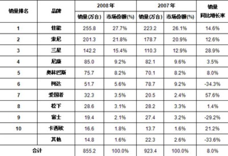 2008年,佳能進一步保持并鞏固其銷售量市場第一的領先地位,市場占比達到27.7%,Sony繼續(xù)保持中國數(shù)碼相機市場的第二名的位置,在其突出的產(chǎn)品攻勢下,市場份額有所上升。三星、尼康和奧林巴斯,分別進入中國數(shù)碼相機市場的前五名。